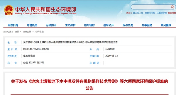 生態(tài)環(huán)境部發(fā)布《地塊土壤和地下水中揮發(fā)性有機物采樣技術(shù)導則》等六項國家環(huán)境保護標準