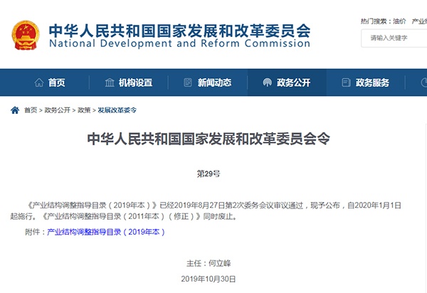 發(fā)改委發(fā)布《產(chǎn)業(yè)結(jié)構(gòu)調(diào)整指導(dǎo)目錄(2019年本)》