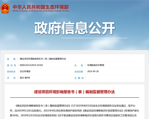 2019年9月20日,生態(tài)環(huán)境部發(fā)布了《建設(shè)項(xiàng)目環(huán)境影響報(bào)告書(表)編制監(jiān)督管理辦法》,詳情如下: