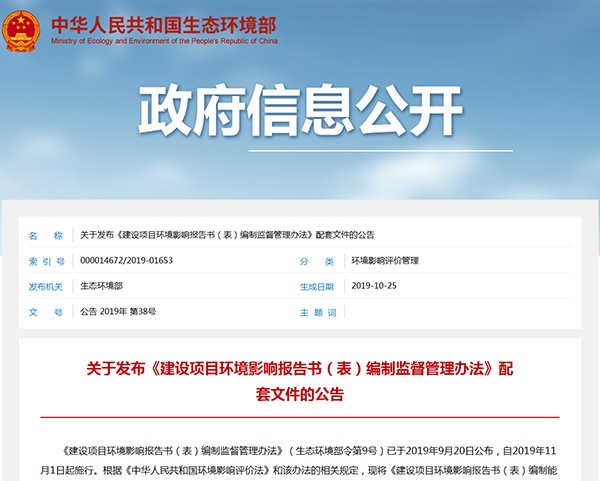 2019年10月25日,生態(tài)環(huán)境部發(fā)布了《建設(shè)項目環(huán)境影響報告書(表)編制監(jiān)督管理辦法》配套文件,詳情如下: