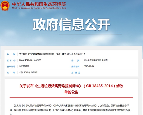 2019年12月20日,生態(tài)環(huán)境部發(fā)布了《生活垃圾焚燒污染控制標(biāo)準(zhǔn)》(GB 18485-2014)修改單,詳情如下: