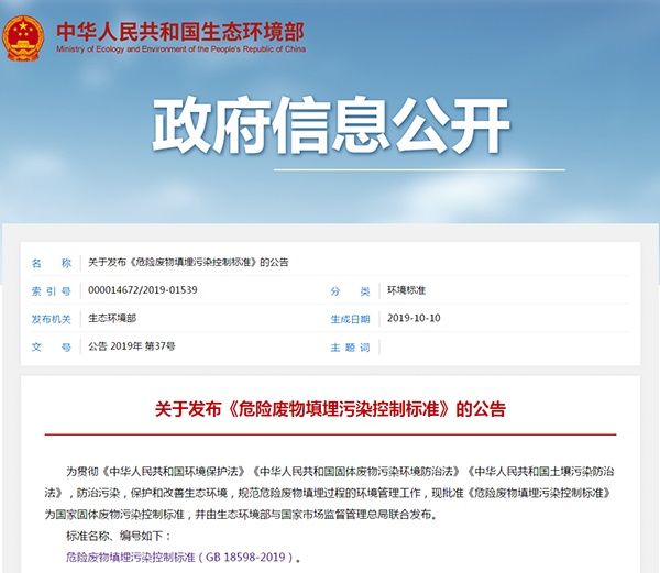 2019年10月10日,生態(tài)環(huán)境部發(fā)布了《危險廢物填埋污染控制標(biāo)準(zhǔn)》,詳情如下: