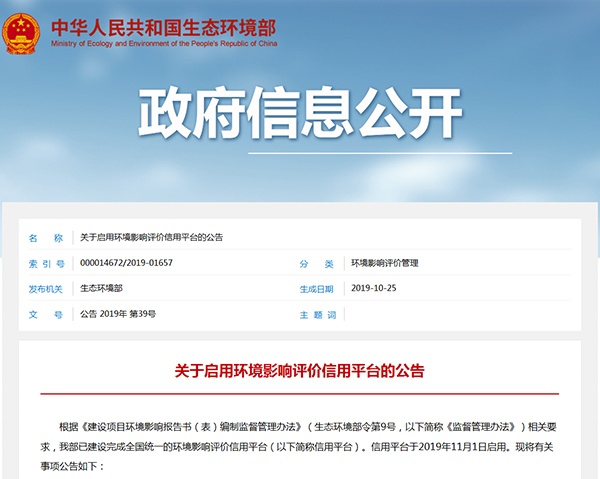 2019年10月25日,生態(tài)環(huán)境部發(fā)布關(guān)于啟用環(huán)境影響評價信用平臺的公告,詳情如下: