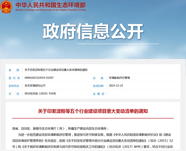 2019年12月23日,生態(tài)環(huán)境部發(fā)布了關(guān)于印發(fā)淀粉等五個(gè)行業(yè)建設(shè)項(xiàng)目重大變動(dòng)清單的通知,詳情如下: