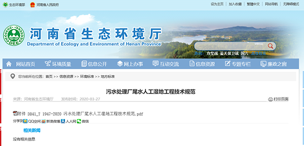 2020年1月21日,河南省生態(tài)環(huán)境廳、河南省市場監(jiān)督管理局聯(lián)合發(fā)布了《污水處理廠尾水人工濕地工程技術規(guī)范》。自2020年4月21日起實施。