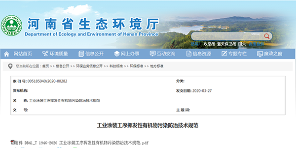 2020年3月27日,河南省生態(tài)環(huán)境廳發(fā)布了《工業(yè)涂裝工序揮發(fā)性有機(jī)物污染防治技術(shù)規(guī)范》(DB41/T 1946-2020),詳情如下: