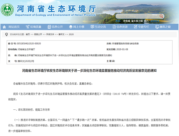 2020年1月8日,河南省生態(tài)環(huán)境廳轉發(fā)了生態(tài)環(huán)境部關于進一步深化生態(tài)環(huán)境監(jiān)管服務推動經濟高質量發(fā)展意見的通知,詳情如下: