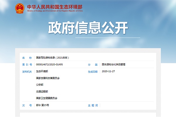 生態(tài)環(huán)境部發(fā)布《國家危險廢物名錄(2021年版)》的公告