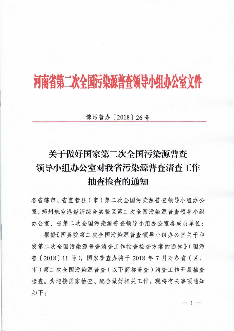 豫污普辦【2018】26號關(guān)于做好國家二污普領(lǐng)導(dǎo)小組辦公室對我省清查工作抽查檢查的通知